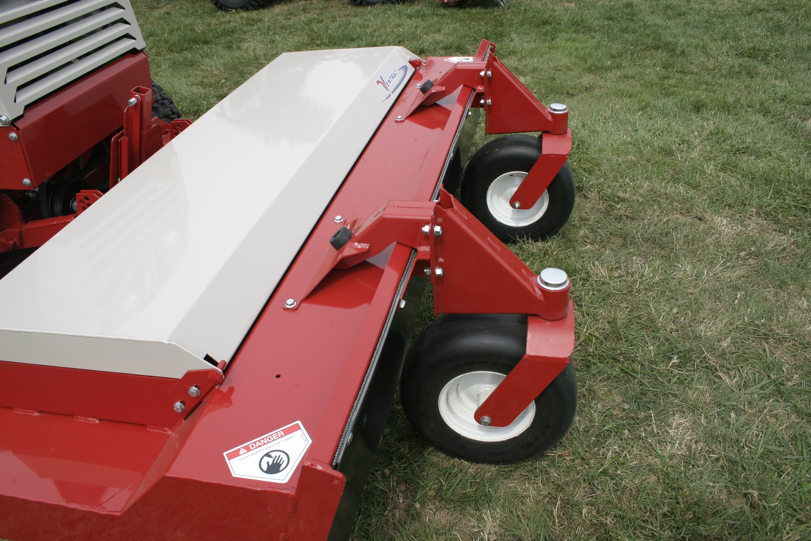 HQ680 Tough Cut Mower Deck Closeup - Shown with the optional Swivel Wheel Kit, great for maneuverability while brush mowing.