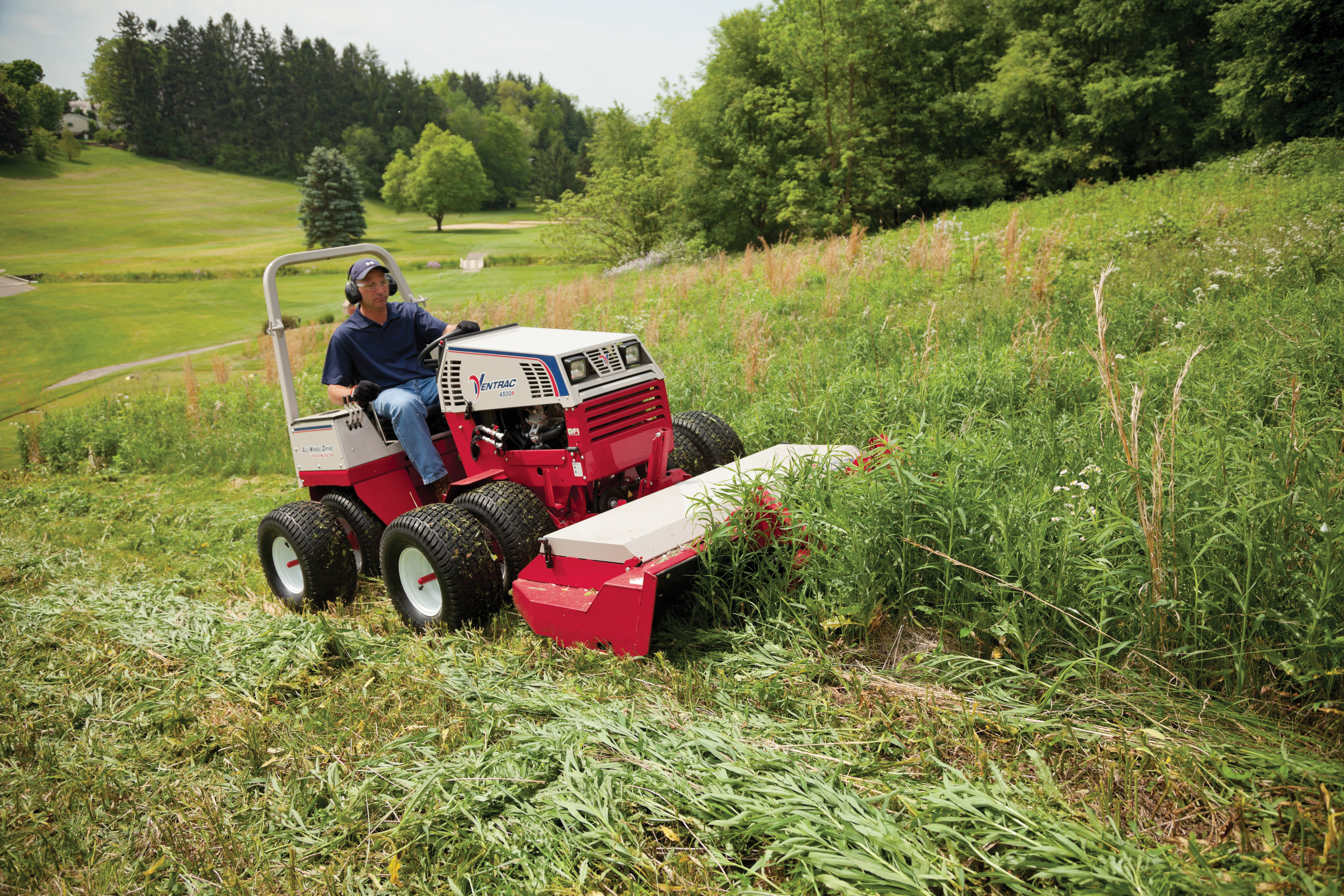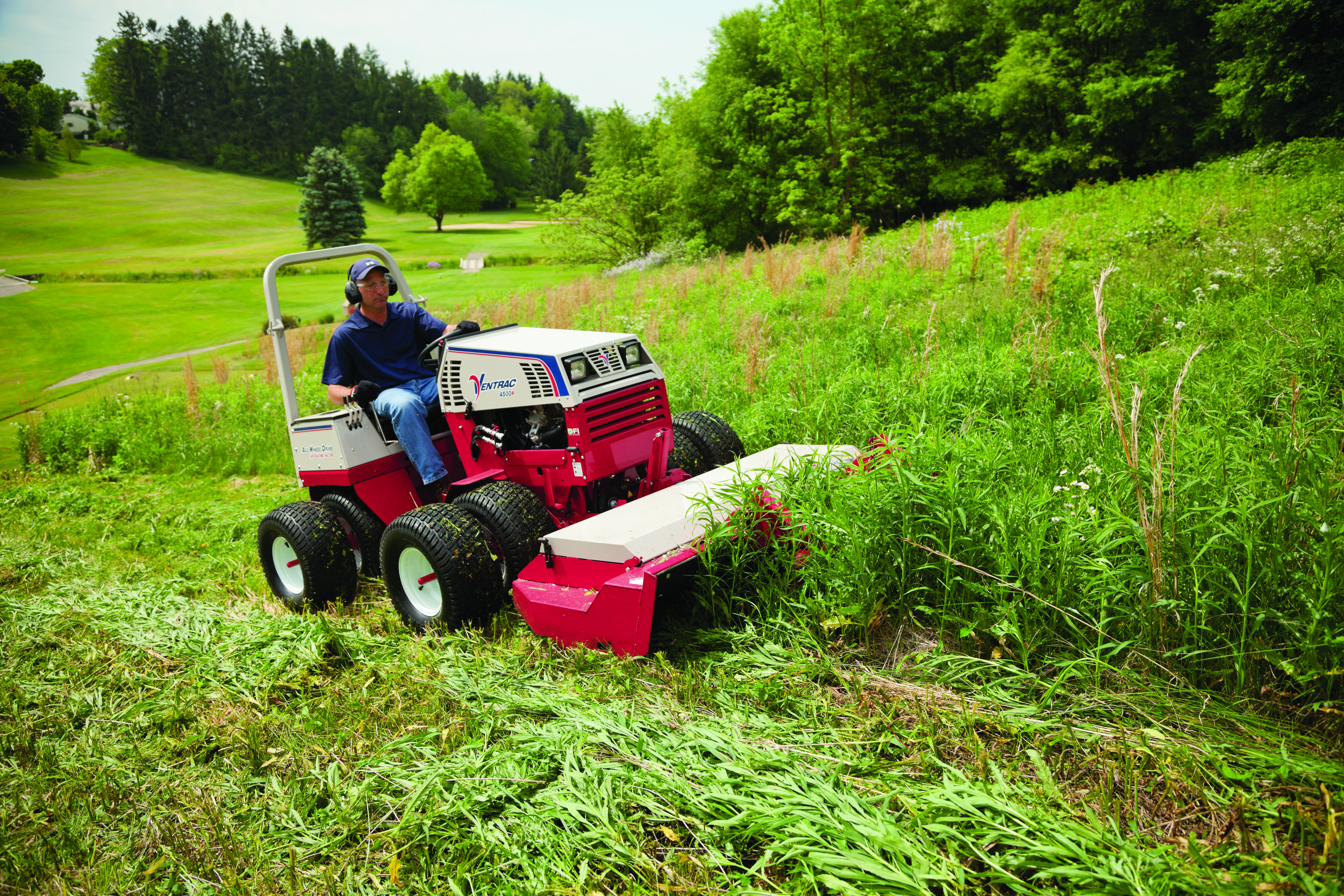| Description | The Ventrac 4500 pictured with optional dual wheels mows an overgrown field with the Tough Cut mower deck. |