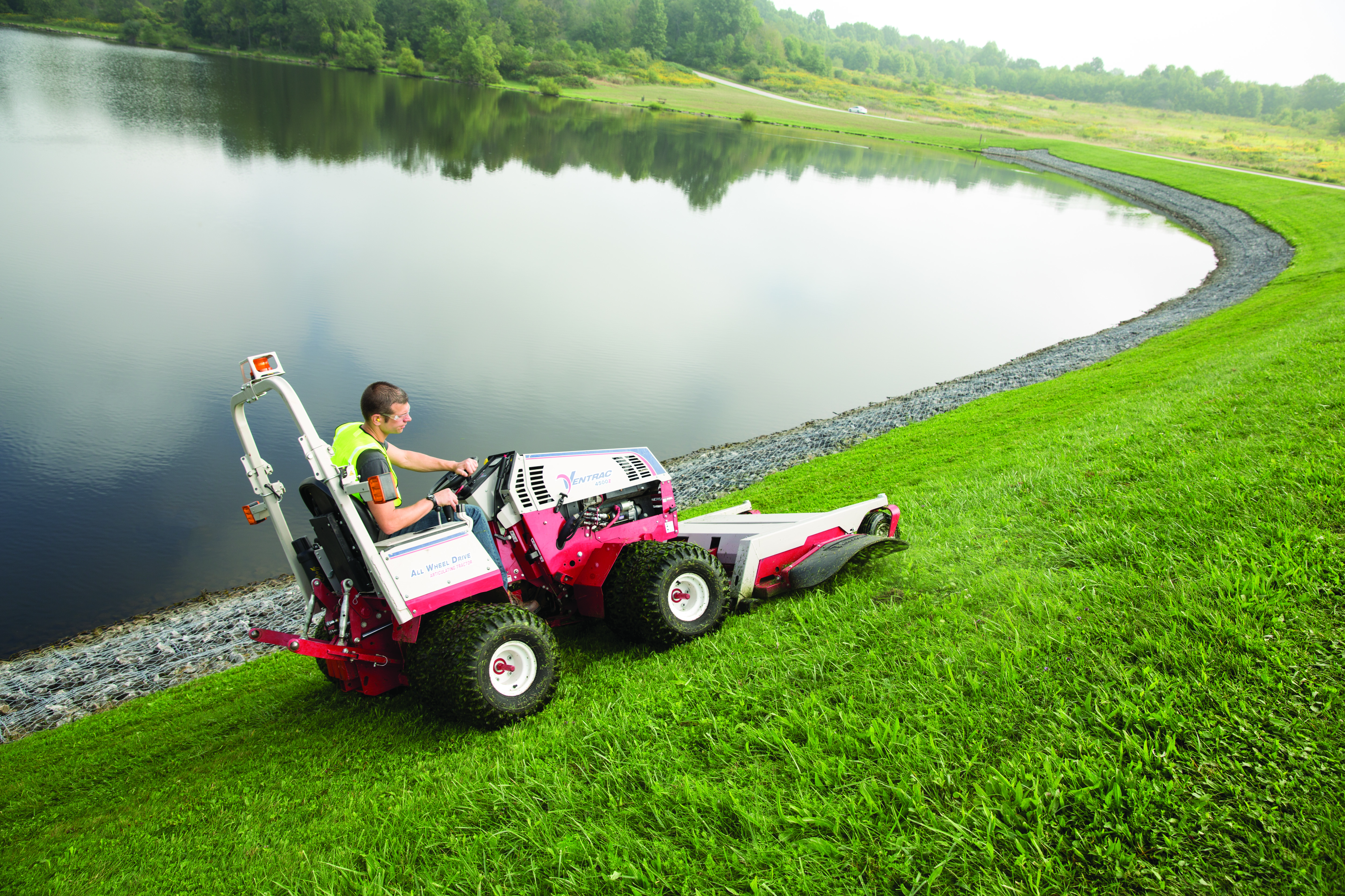 | Description | All-wheel drive and articulated steering help make the Ventrac safer in tough spots such as a grassy slope next to a lake or pond. |