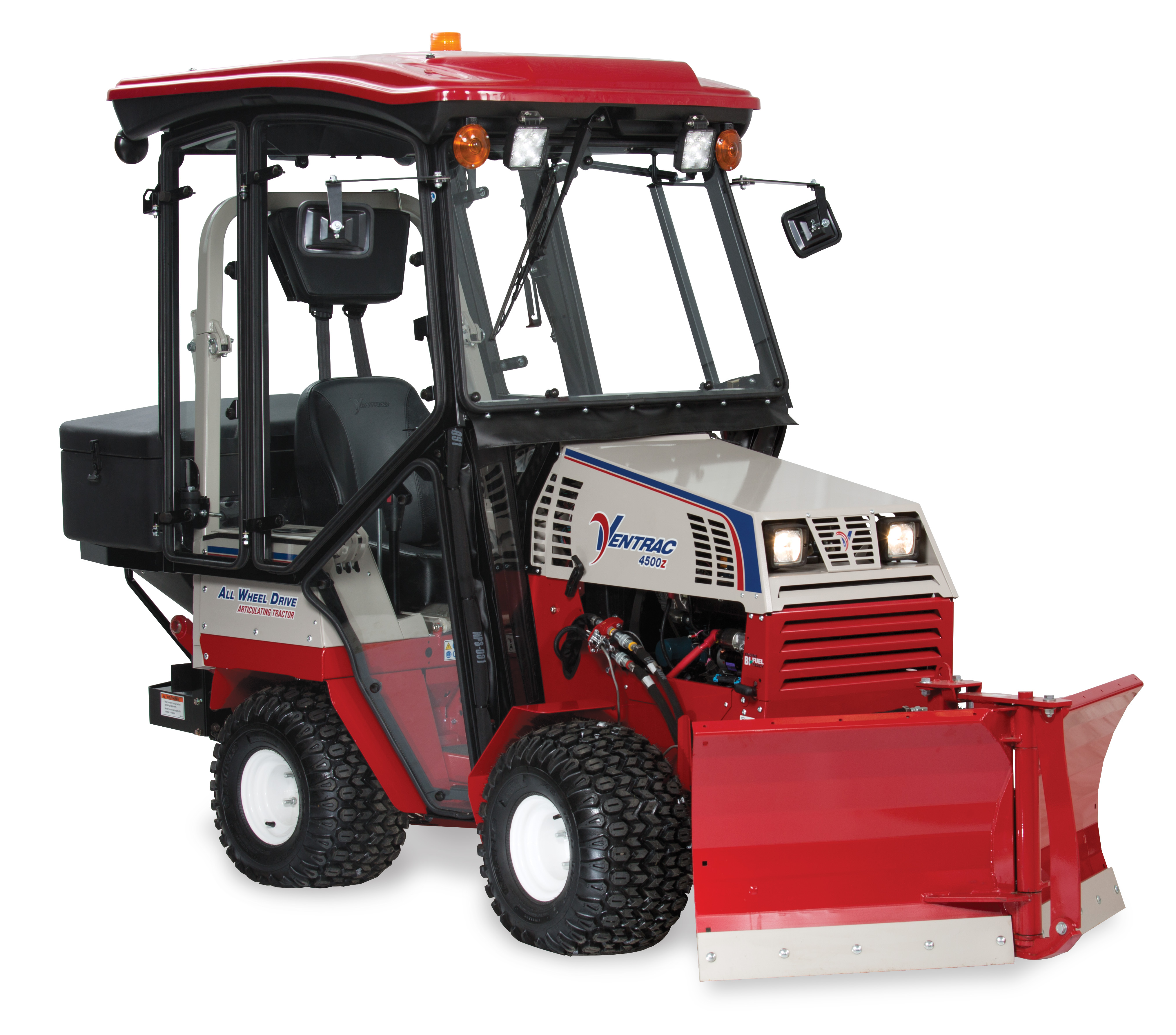 Ventrac 4500Z with Snow Package right side - Shown here with V-Blade, Fully enclosed cab, and Broadcast Spreader.