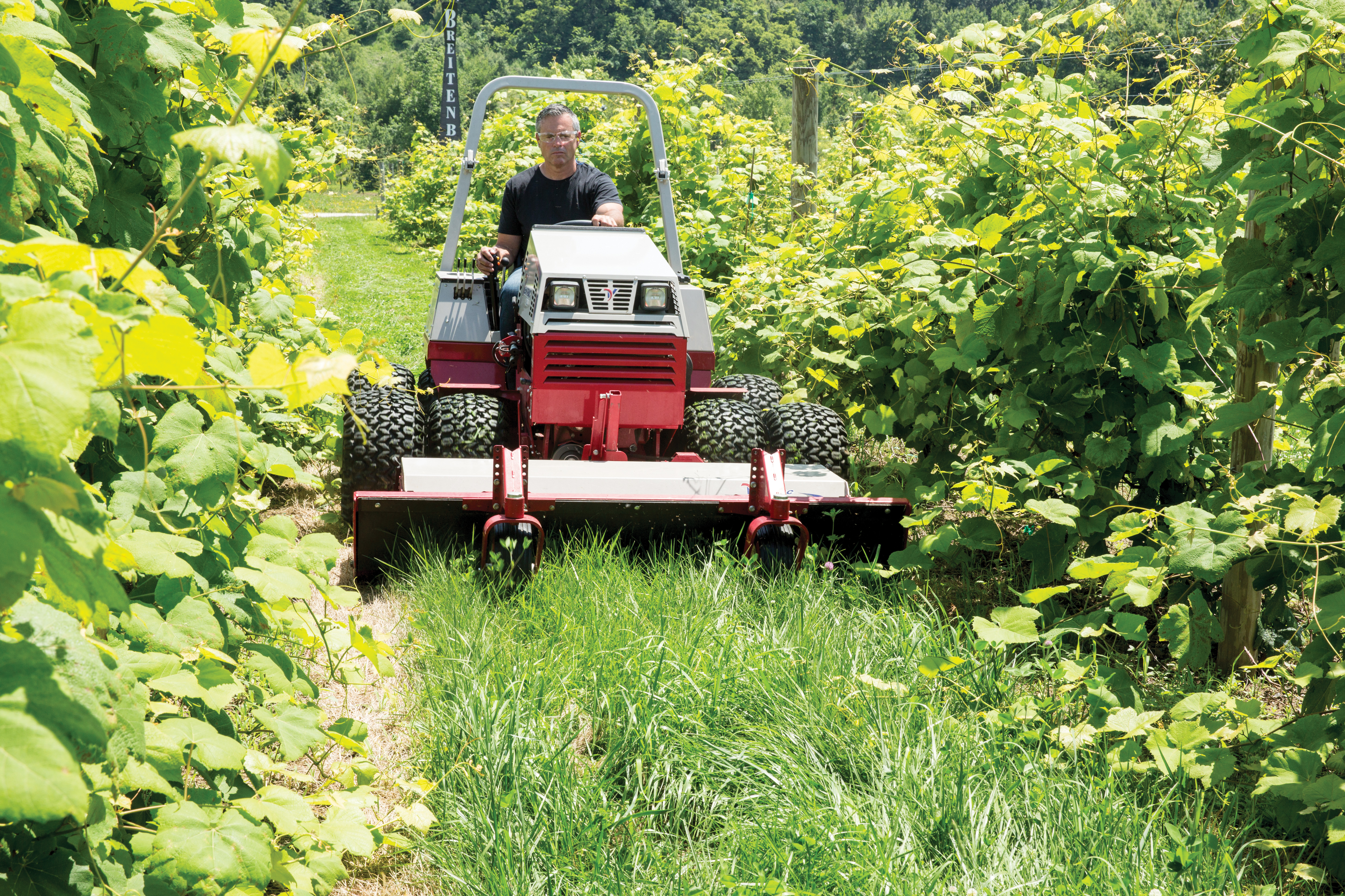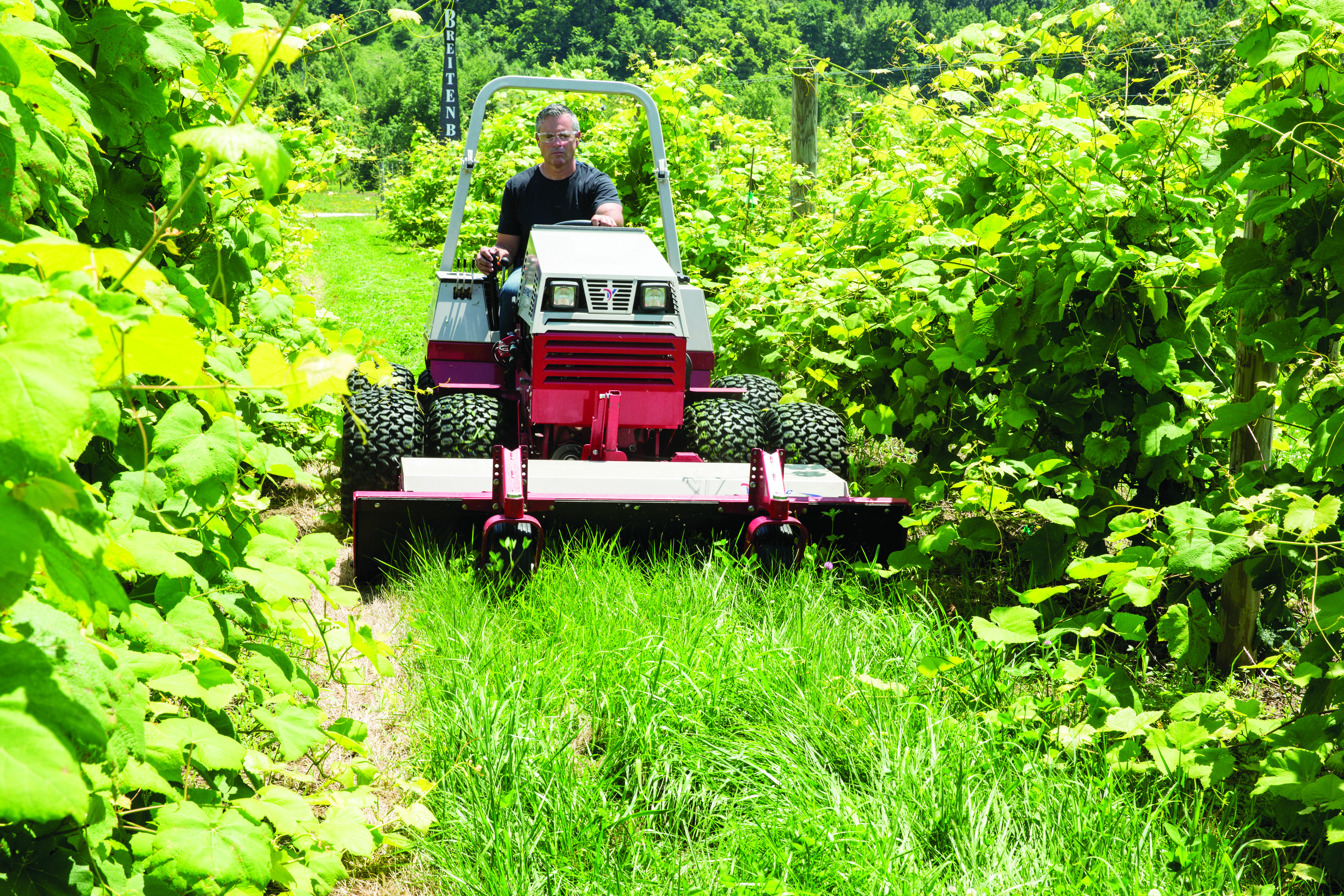 Ventrac 4500 Mowing High Grass - The Tough Cut Mower is perfect for places such as vineyards because its ability to cut everything from overgrown grass to saplings while reducing flying material that damages nearby vines and plants.