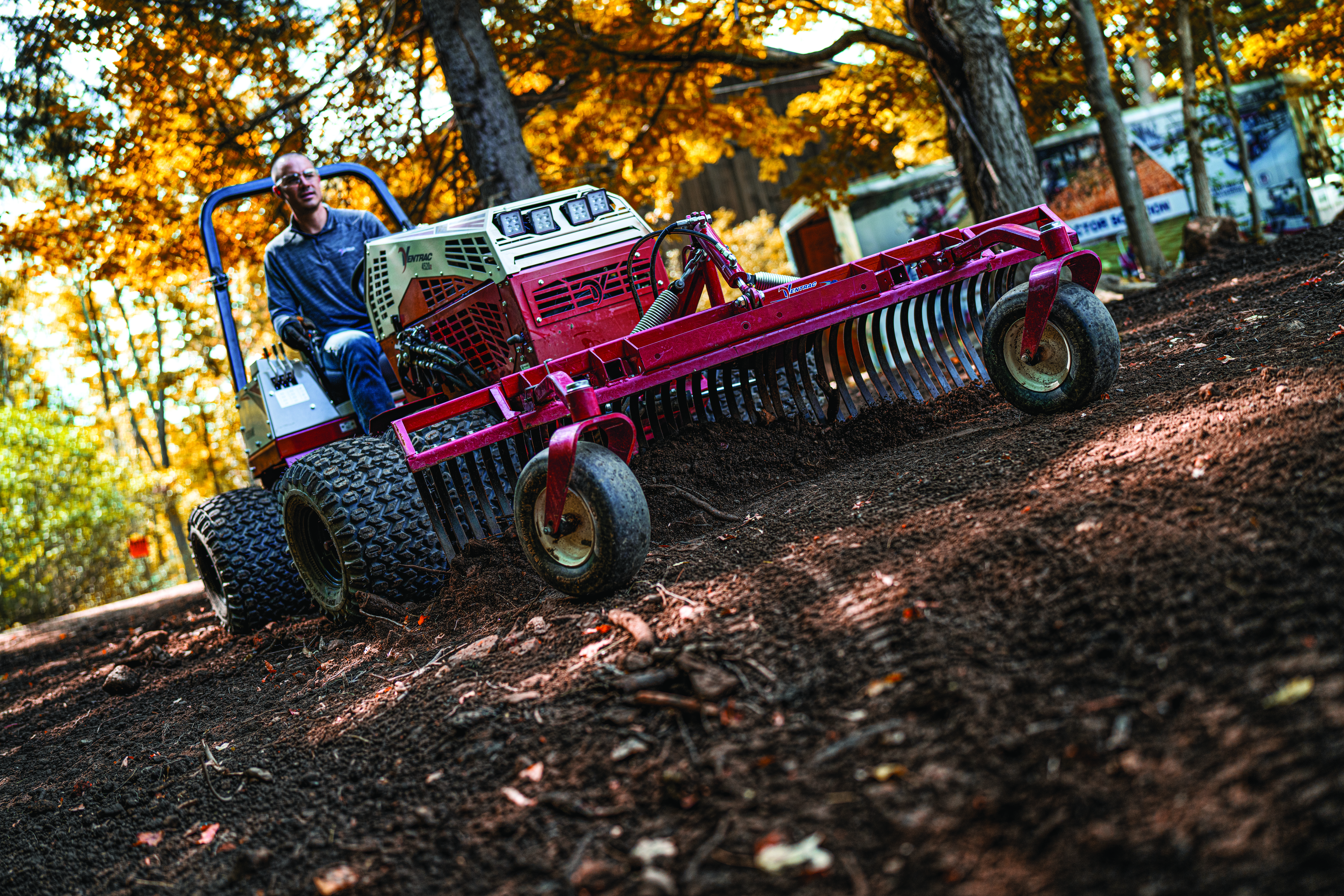 | Description | Ventrac Landscape Rake being used to clean up lawn debris prior to seeding, a feature of Ventrac's broad landscape offering. |