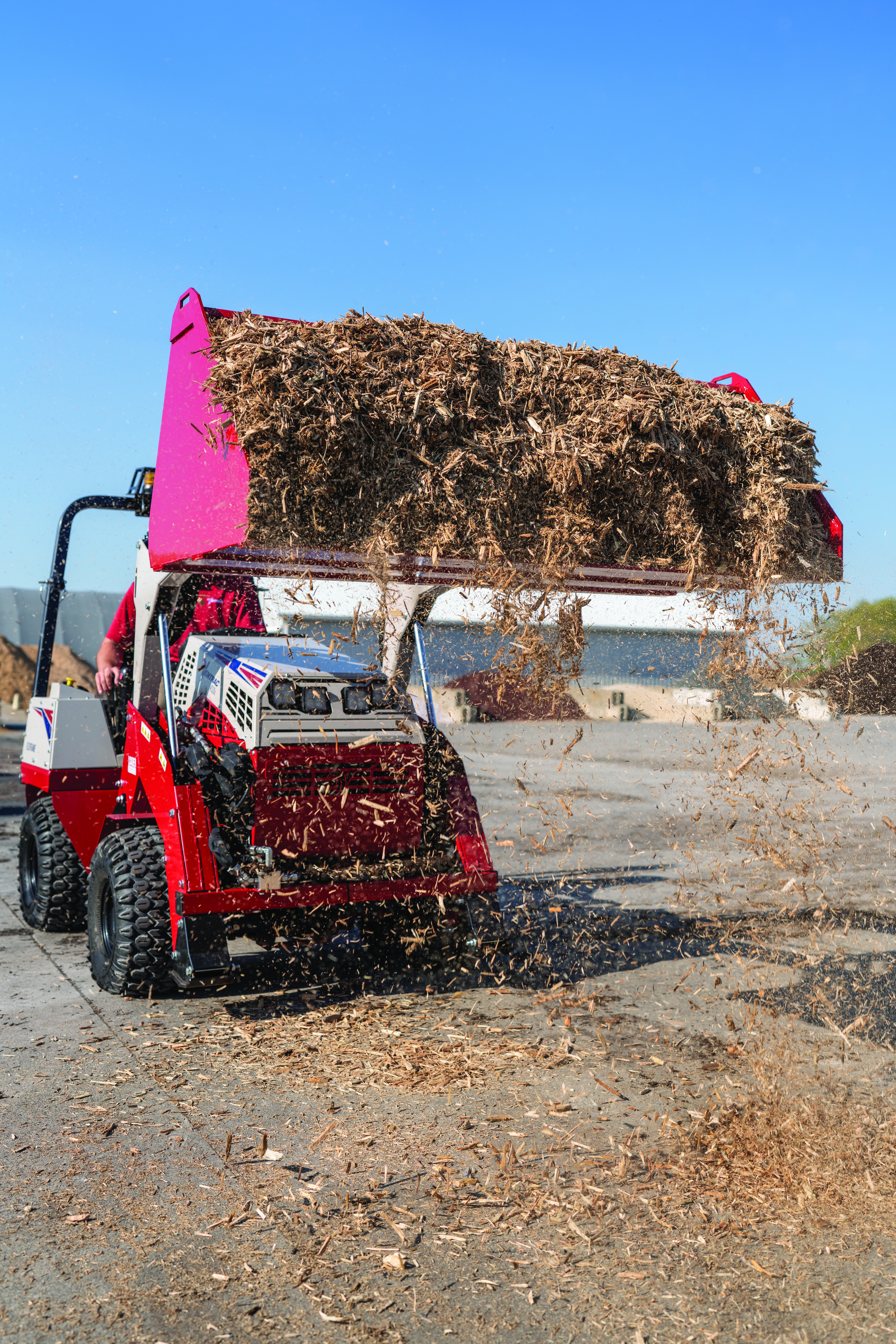 DescriptionThe Ventrac Light Material Bucket full of mulch in the lifted position.