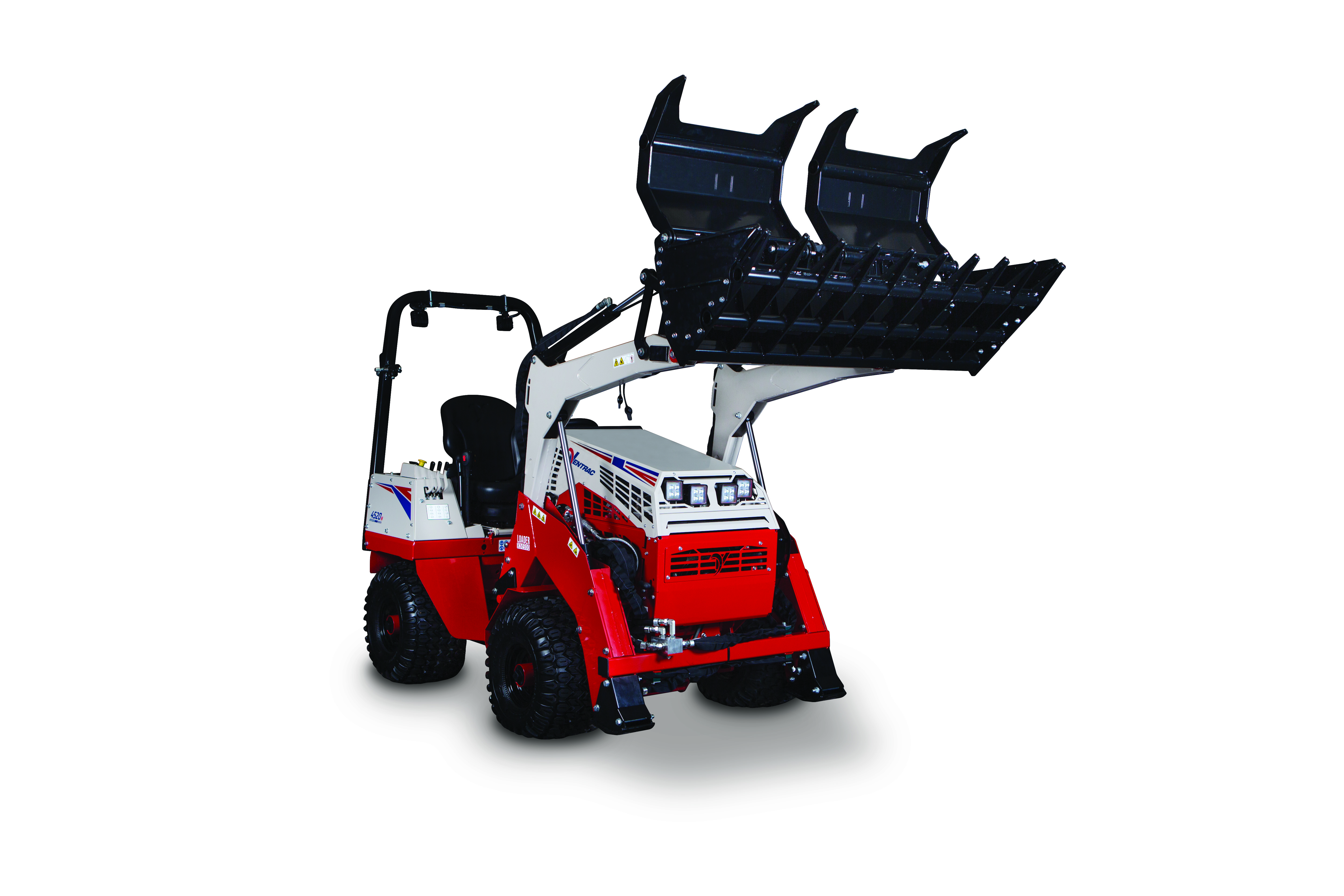 | Description | Ventrac Loader equipped with the KM100 Rock Bucket Grapple open in the lifted position. |