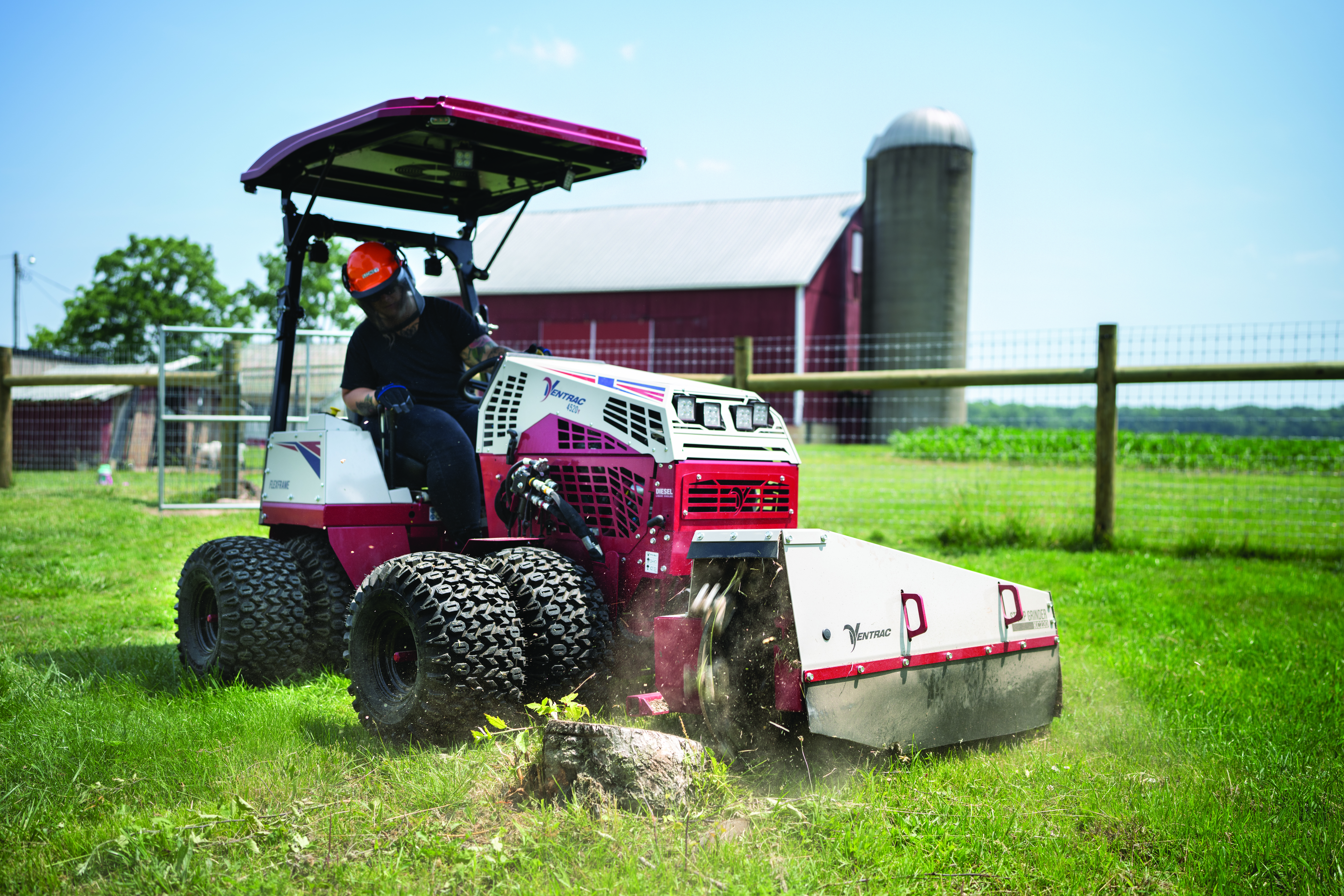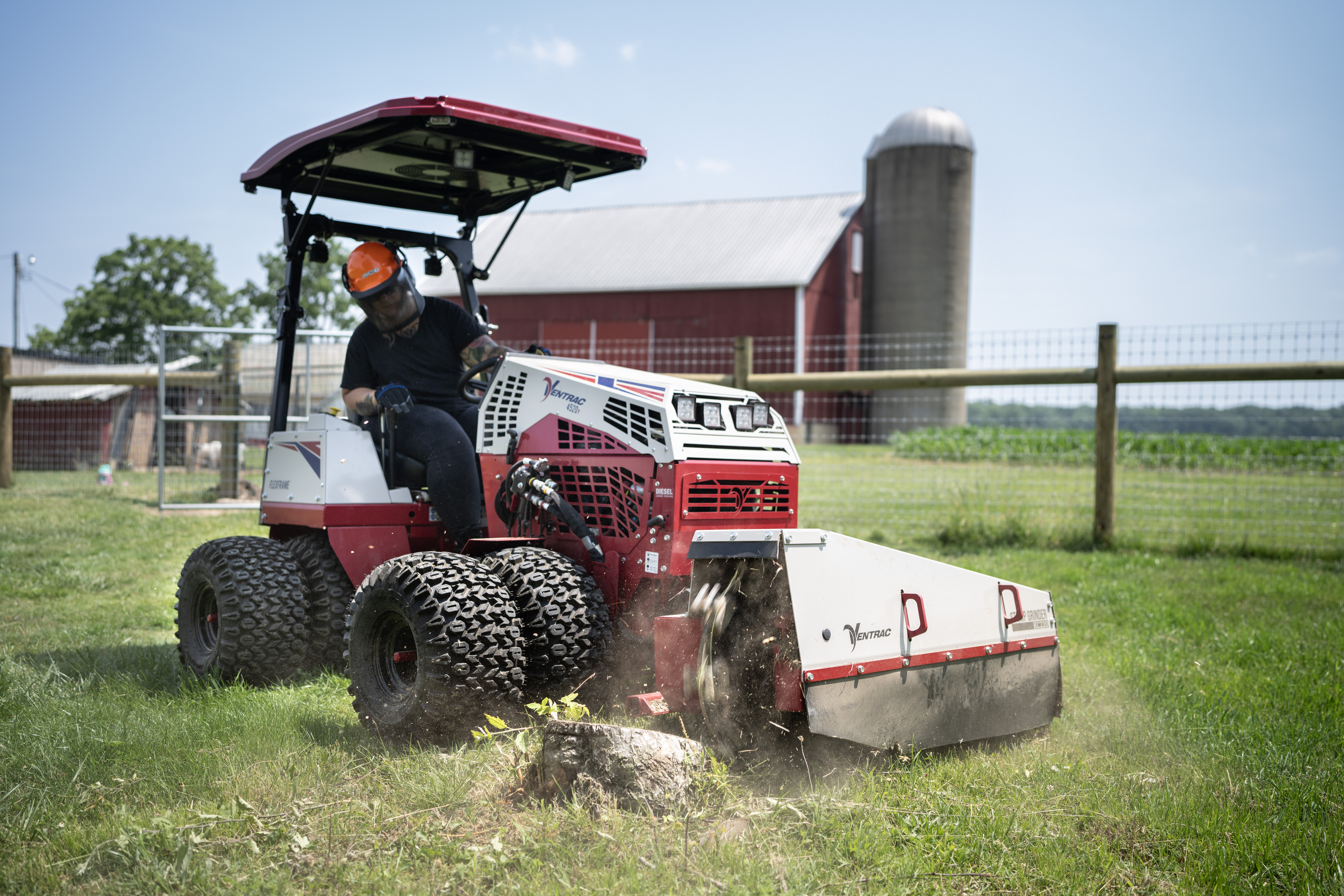 | Description | Ventrac 4520 with duals and a canopy removing a small stump with its PTO driven stump grinder. |