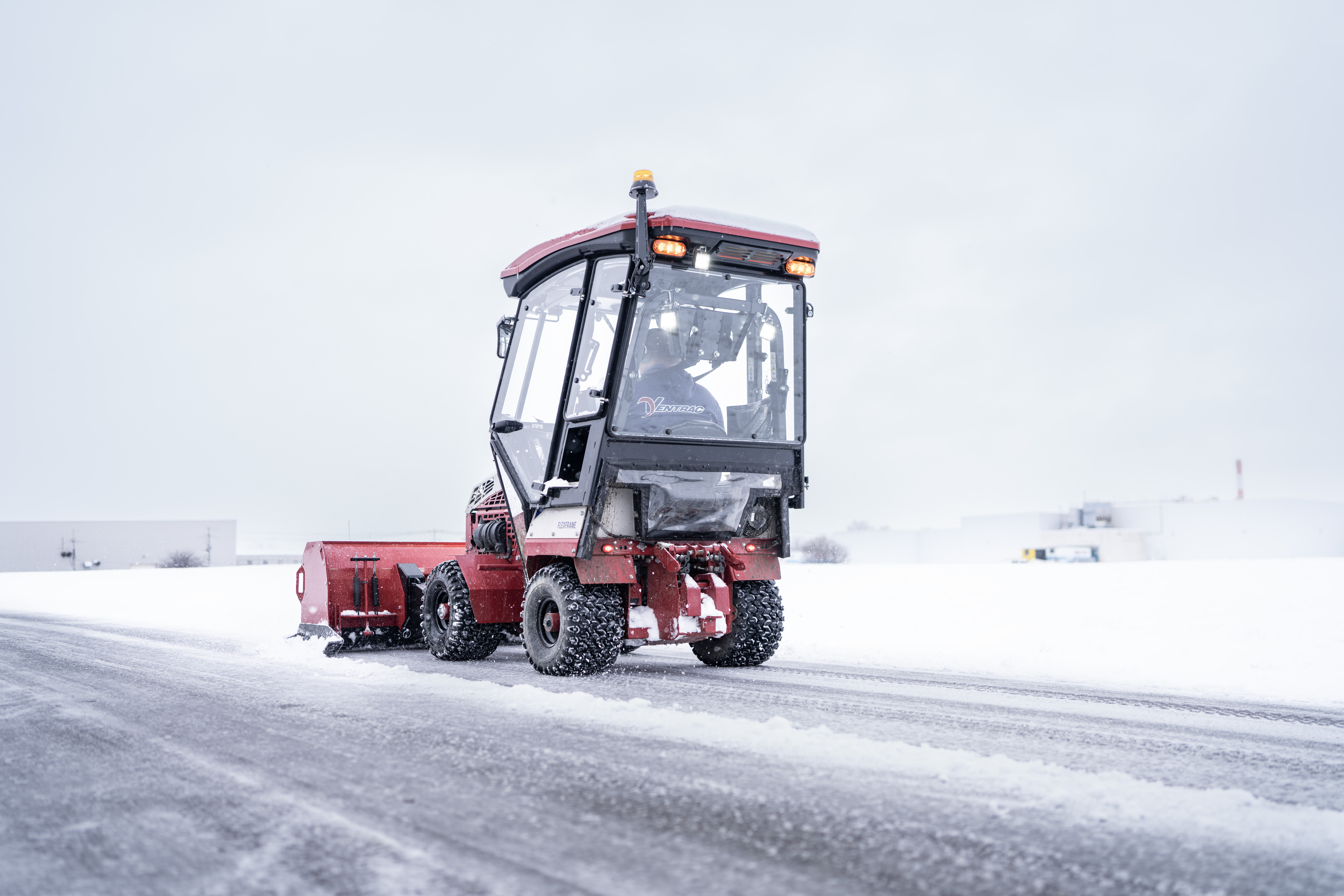 | Description | Rear view of Ventrac equipped with a Cab and Box blade pushing snow. |