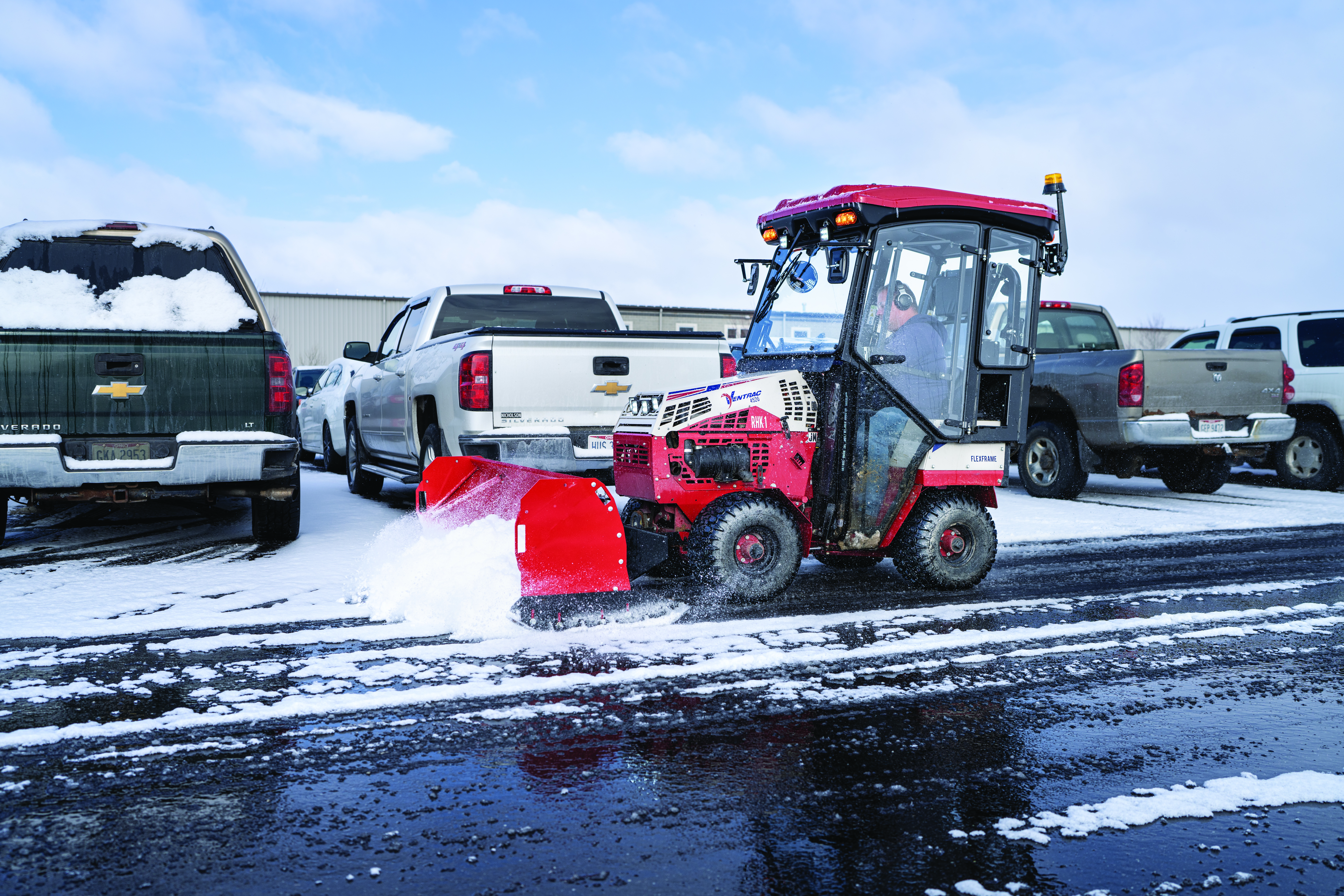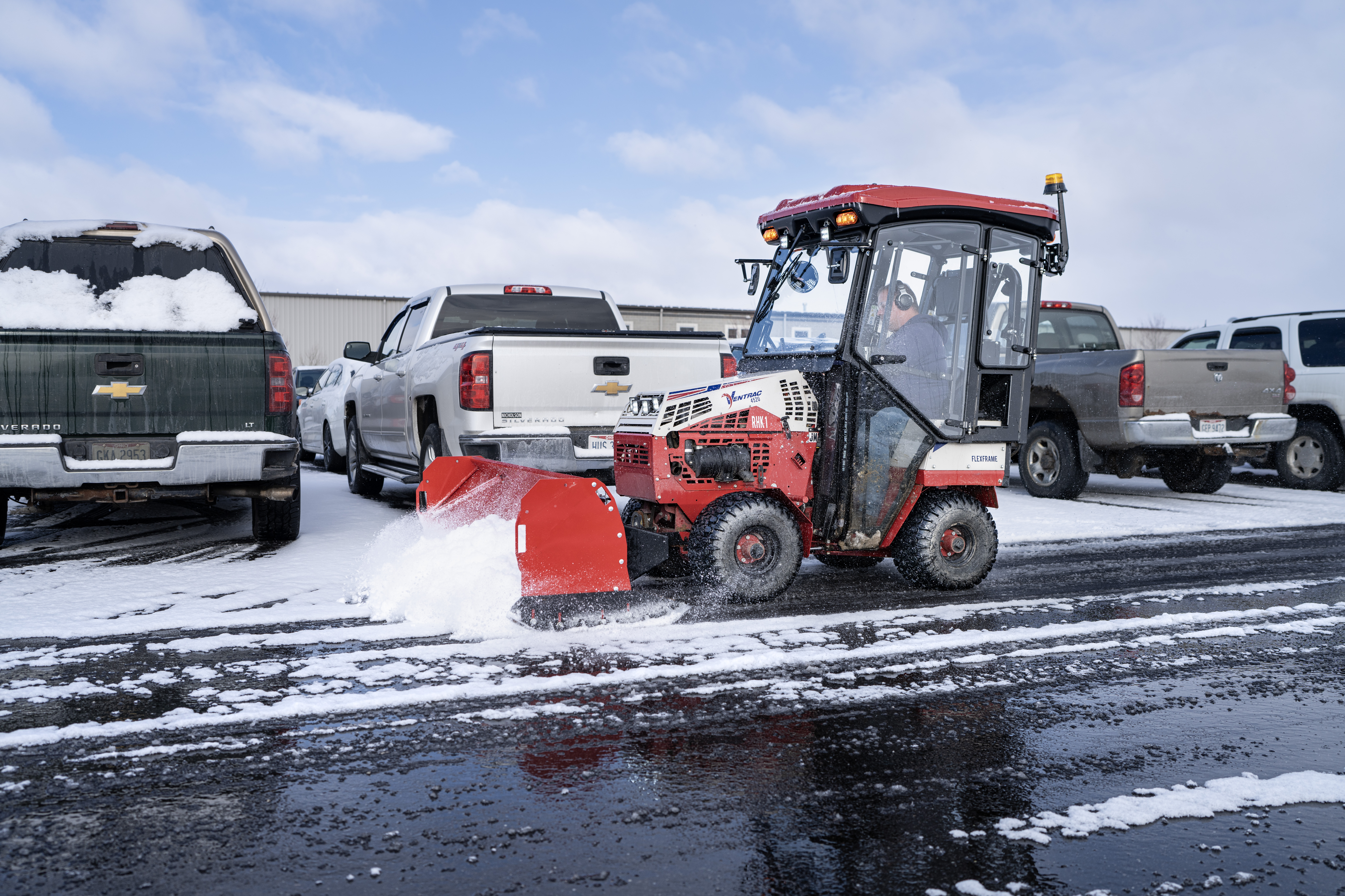 | Description | Ventrac Box Snow Plow pushing snow away from vehicles. |
