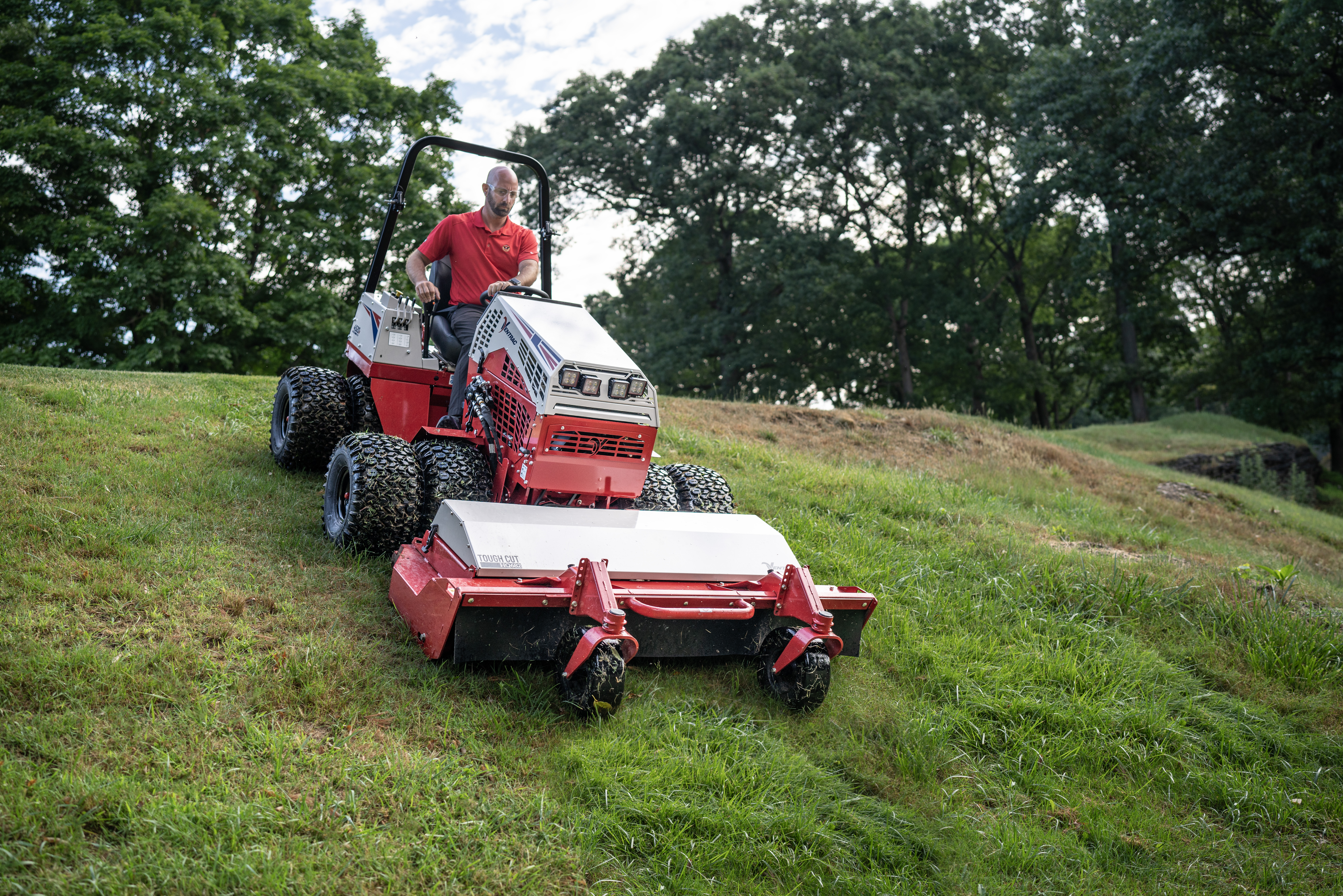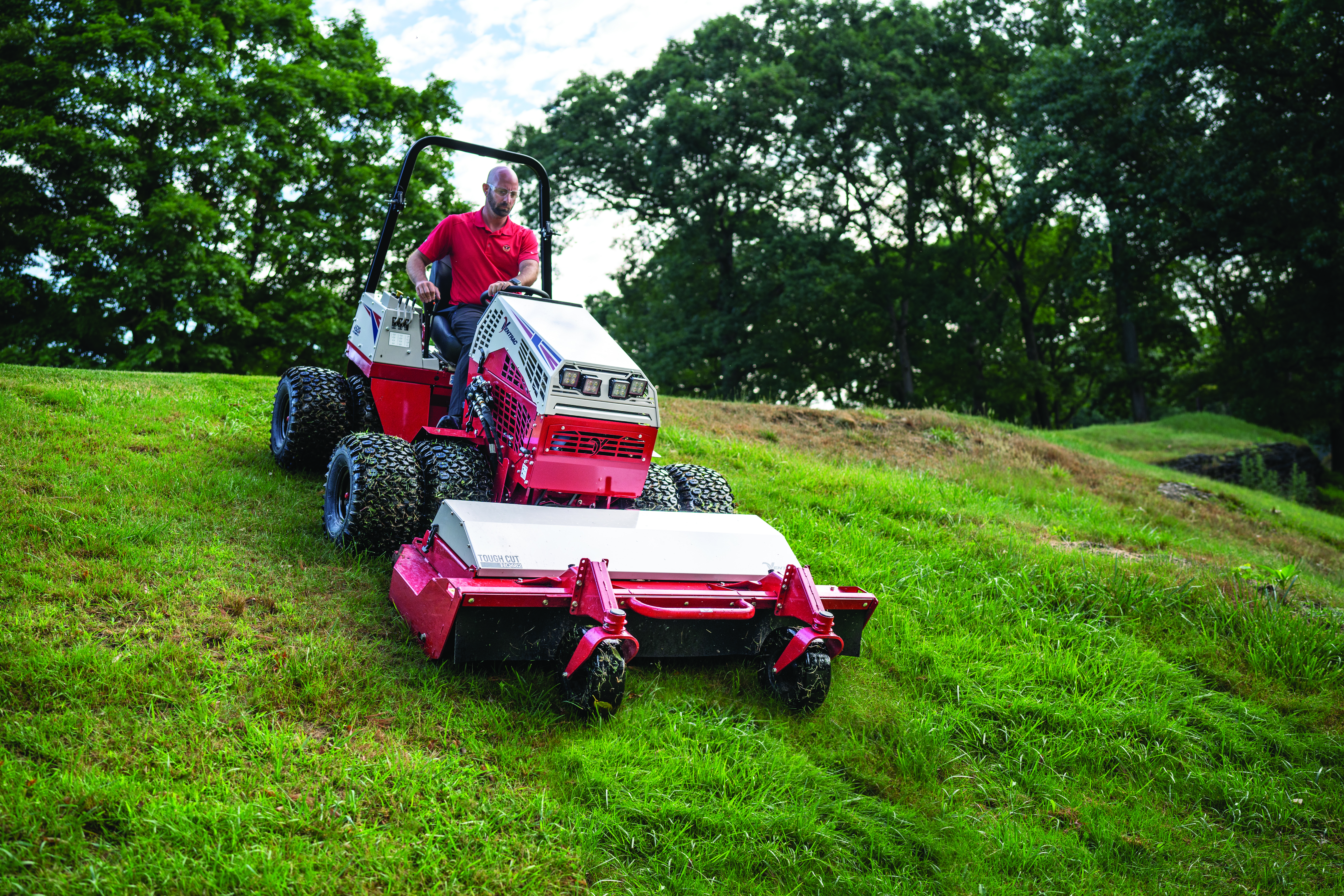 | Description | The Ventrac 4520 maintains precise control while descending a steep slope, thanks to its low center of gravity, performance-engineered tires, and weight transfer system, ensuring efficient operation on challenging terrains. |