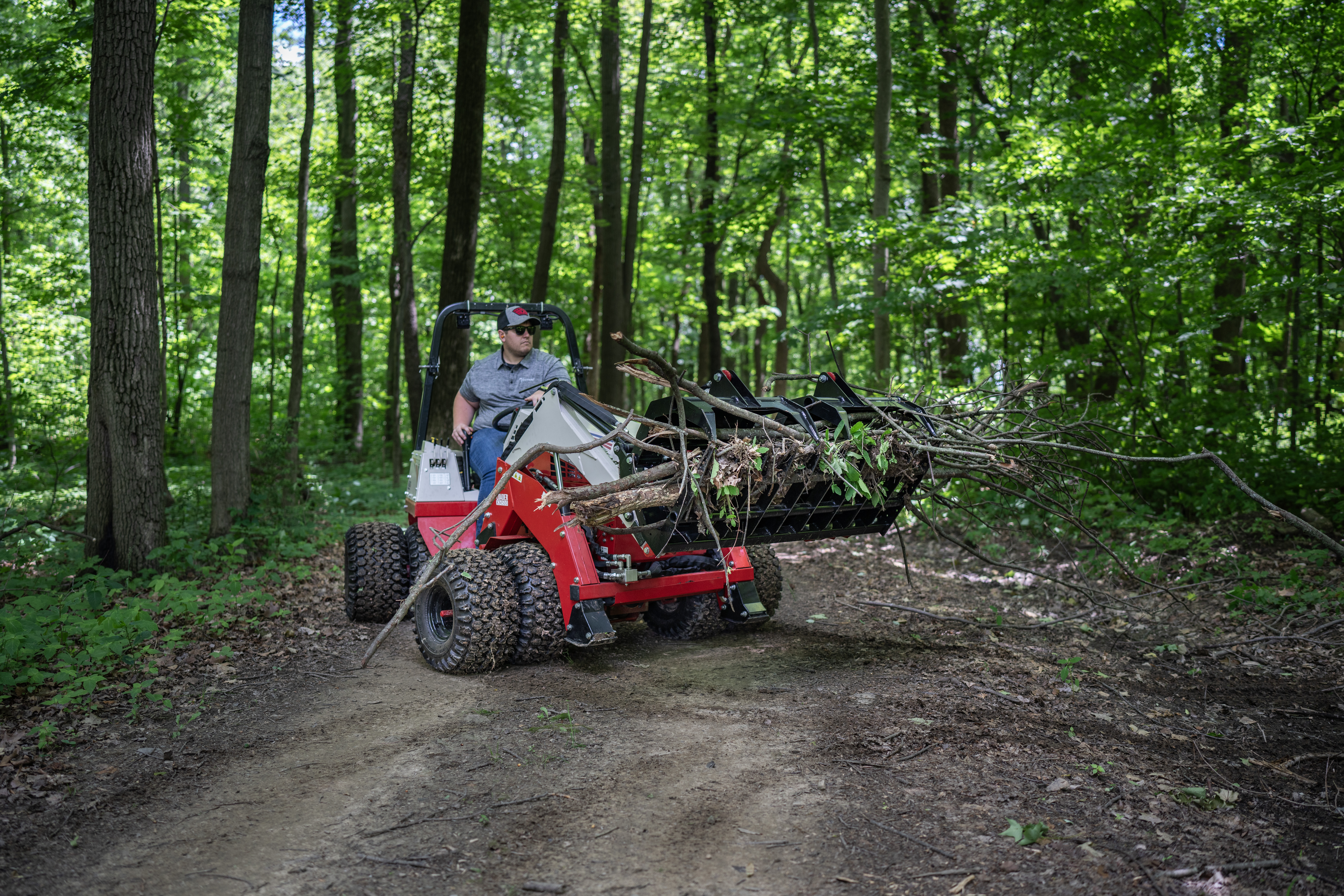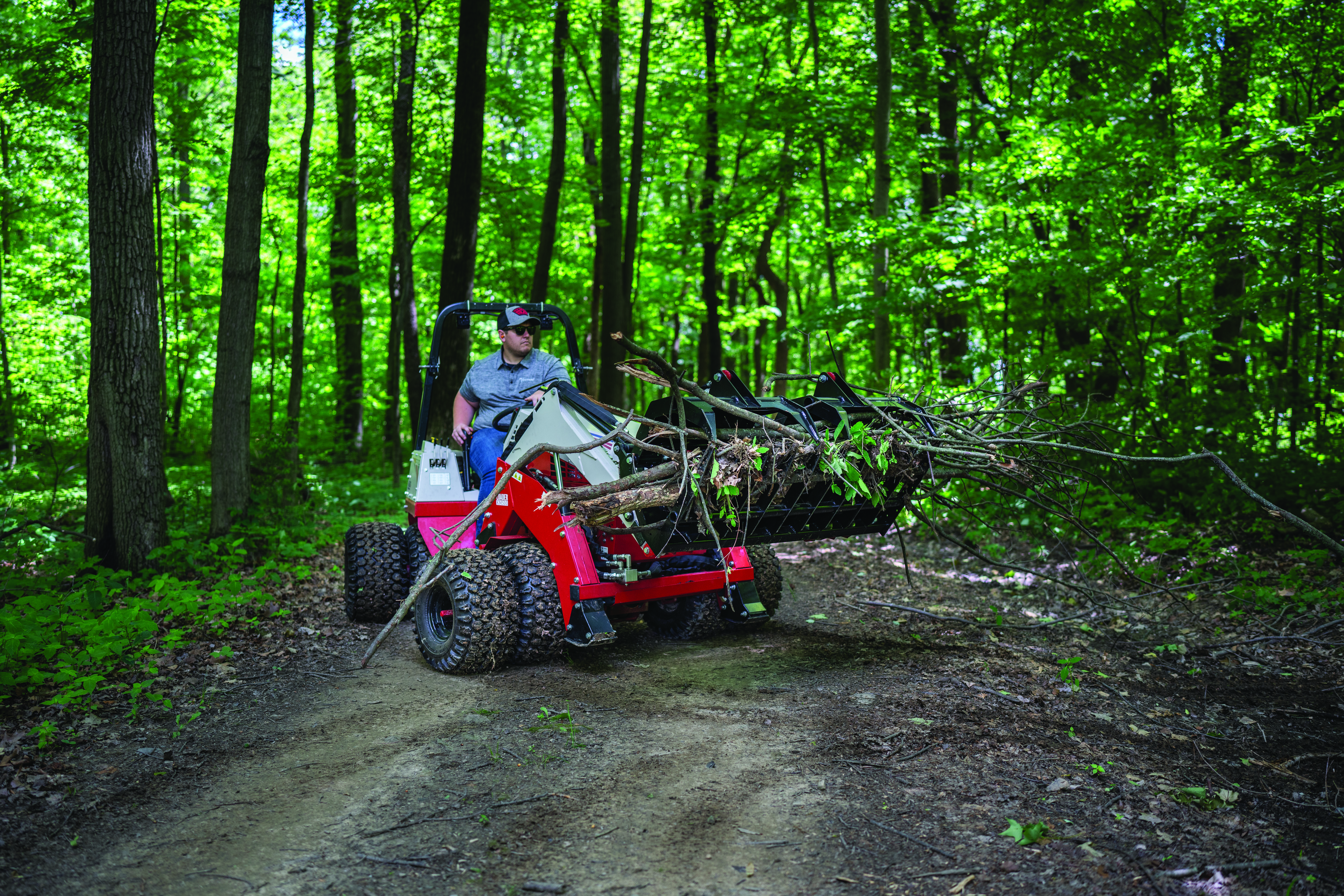 Ventrac Loader - The Ventrac KM500 Loader demonstrates exceptional maneuverability as it weaves on and off wood trails. This versatility, combined with the Ventrac 4520’s turf-friendly design, ensures efficient trail clearing while navigating tight spaces with ease.
