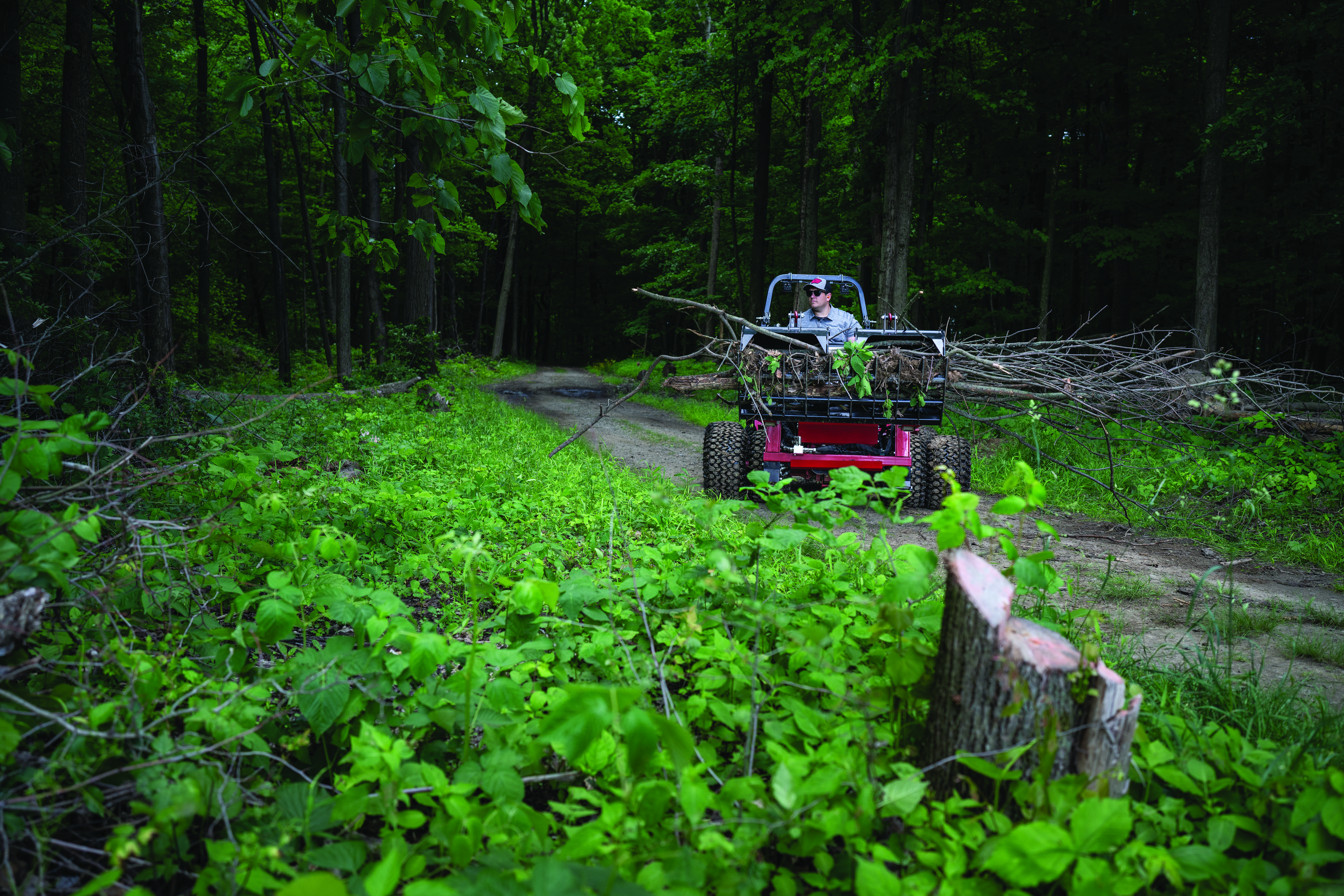 Ventrac Loader - Clearing wood trails is a breeze with the Ventrac KM500 Loader, designed to maximize the capability of the Ventrac 4520. Its easy installation and operation, combined with a dual-wheeled tractor for minimal ground impact, make it an ideal choice for efficient trail maintenance.