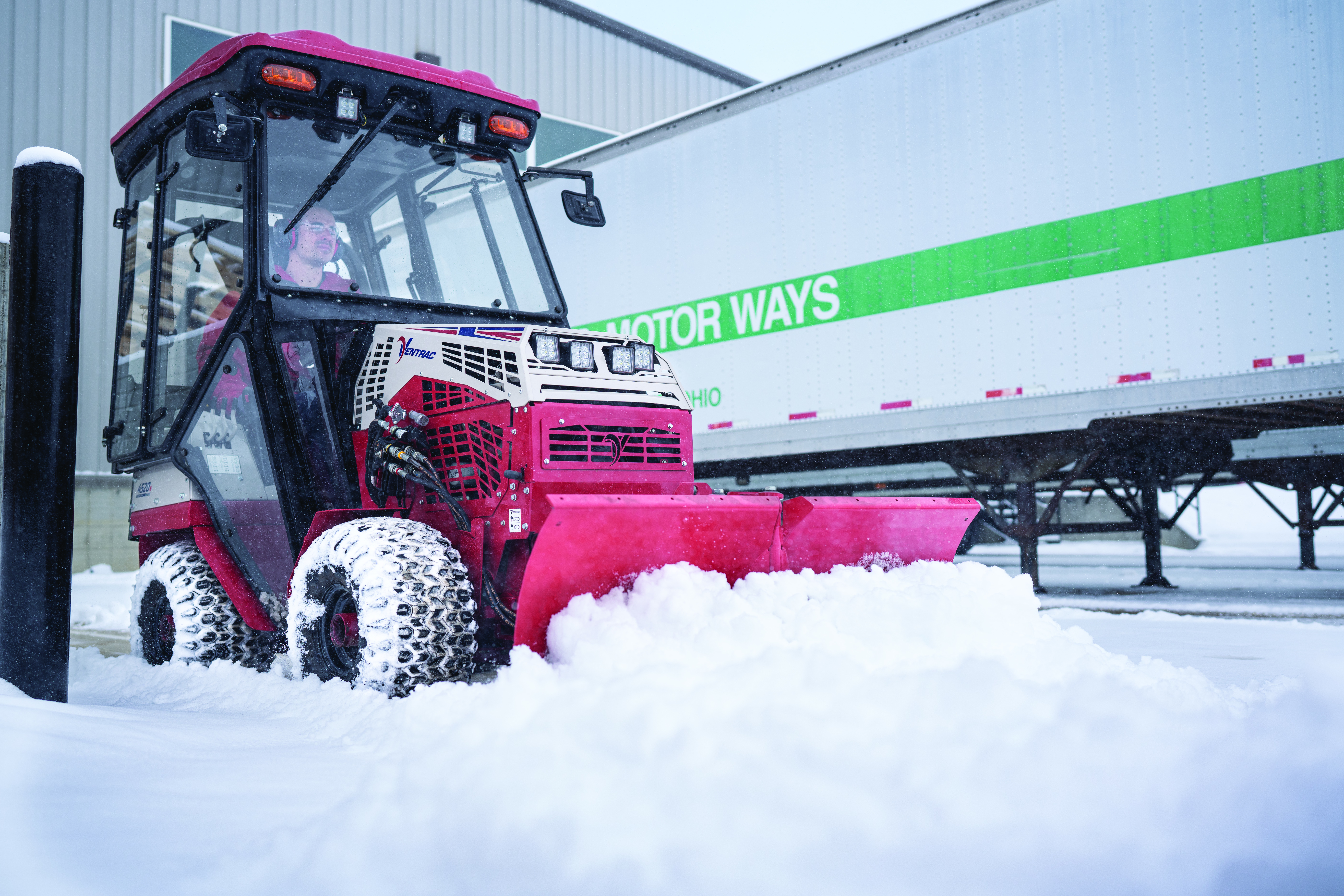 | Description | The Ventrac 4520 with a V-Blade clears snow between parked semis in a loading dock, maneuvering through tight spaces where larger plows can’t go. Its compact design allows the operator to remove snow efficiently without blocking access, keeping the area clear and ensuring business runs smoothly. |