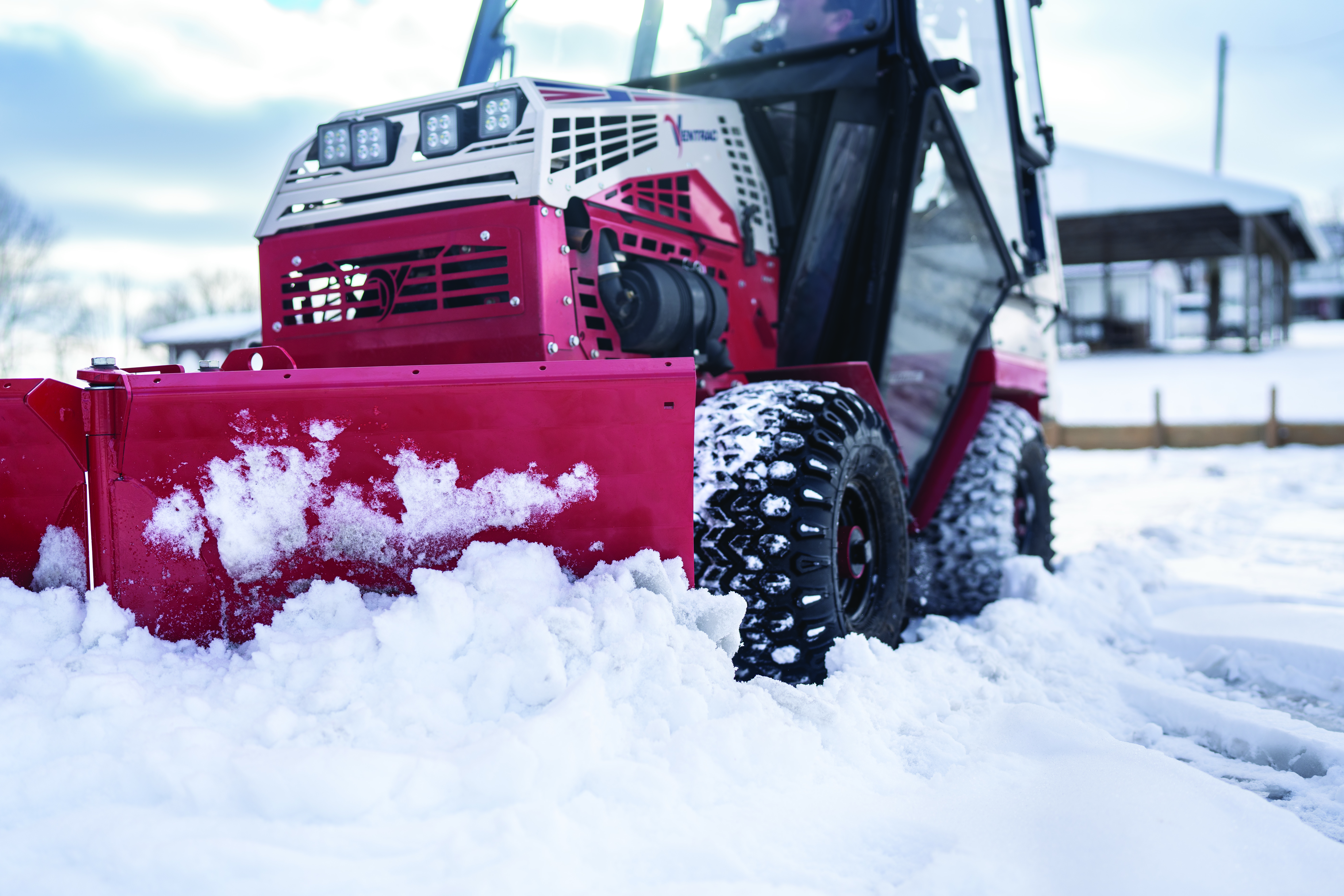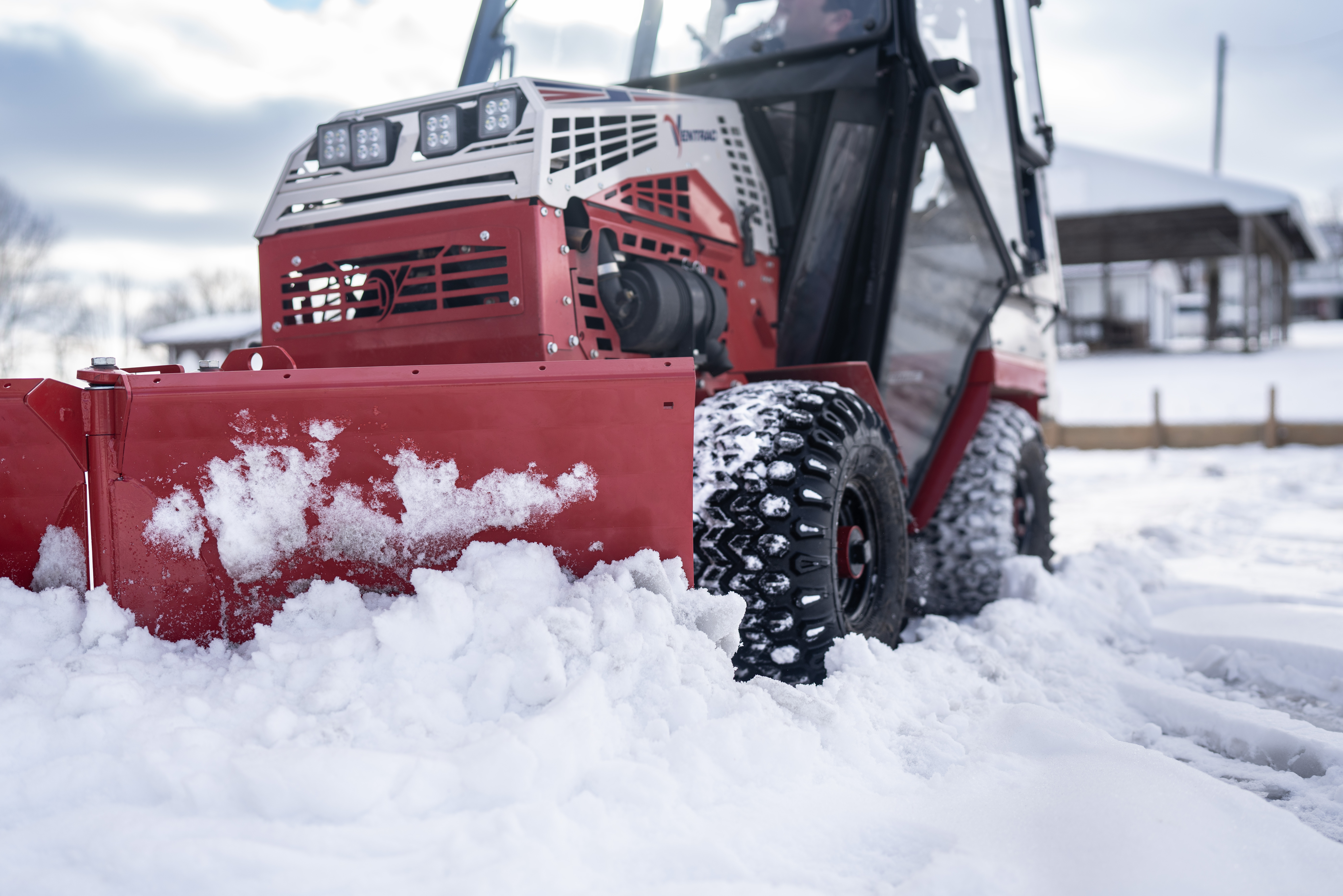 Ventrac V-Blade - A Ventrac 4520 with a V-Blade attachment clears a small parking lot, pushing heavy snow into neat piles. The blade’s angled position directs the snow efficiently, revealing clean pavement underneath. The tractor’s compact design allows it to maneuver easily in tight spaces.