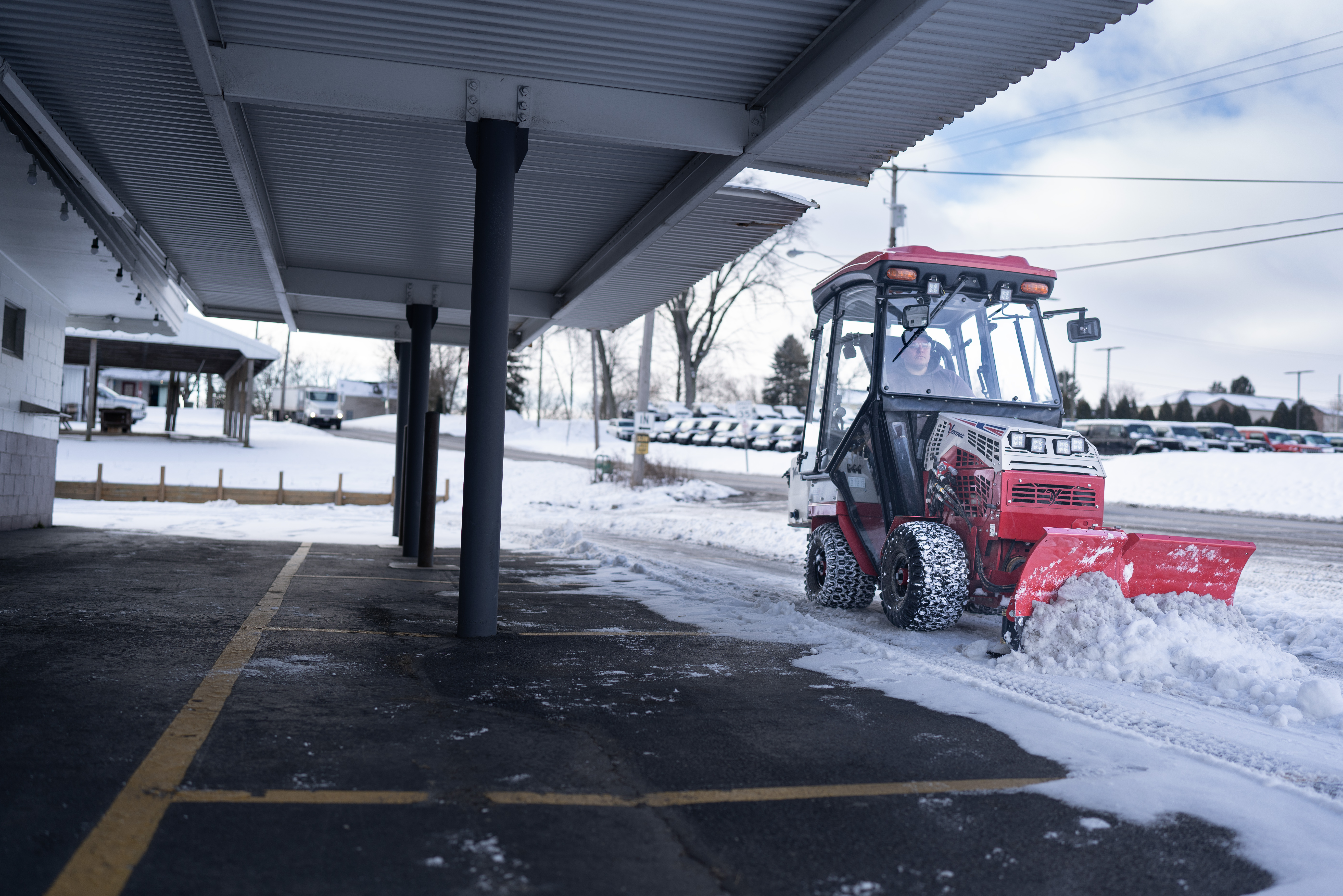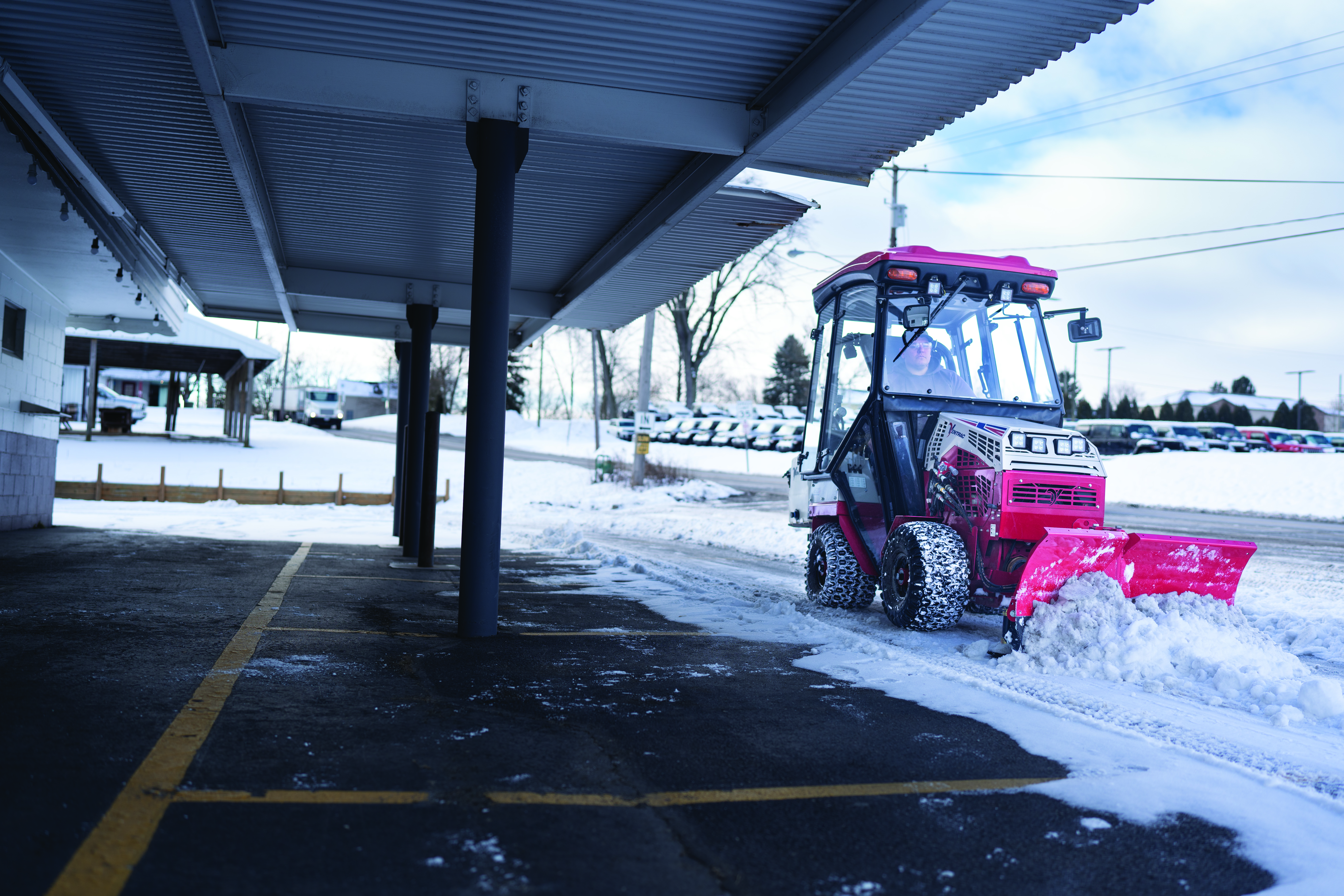 | Description | The Ventrac 4520 with a V-Blade works in a tight space beneath a building overhang, clearing snow where larger equipment cannot go. Its compact size allows the operator to work close to walls and structures. |