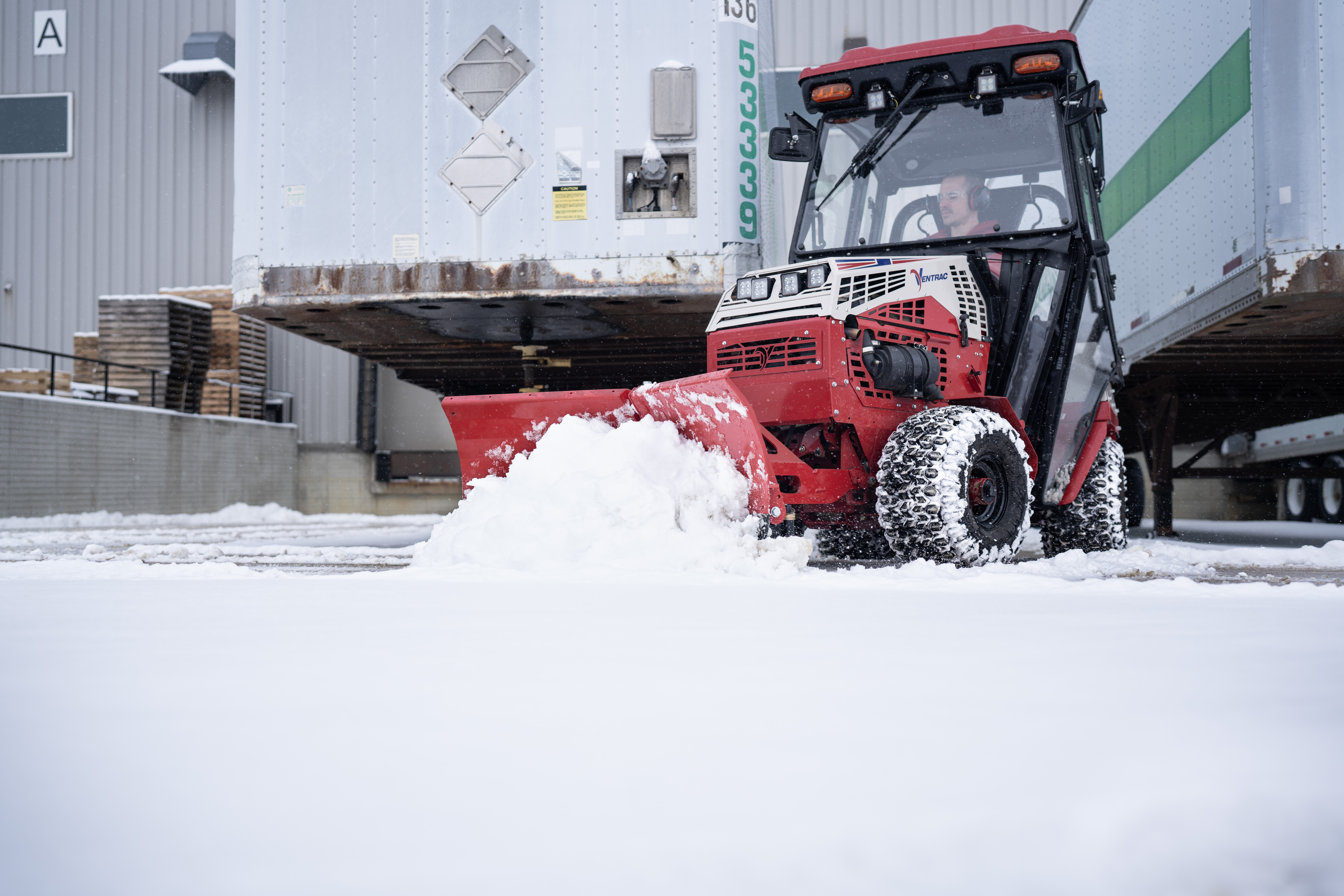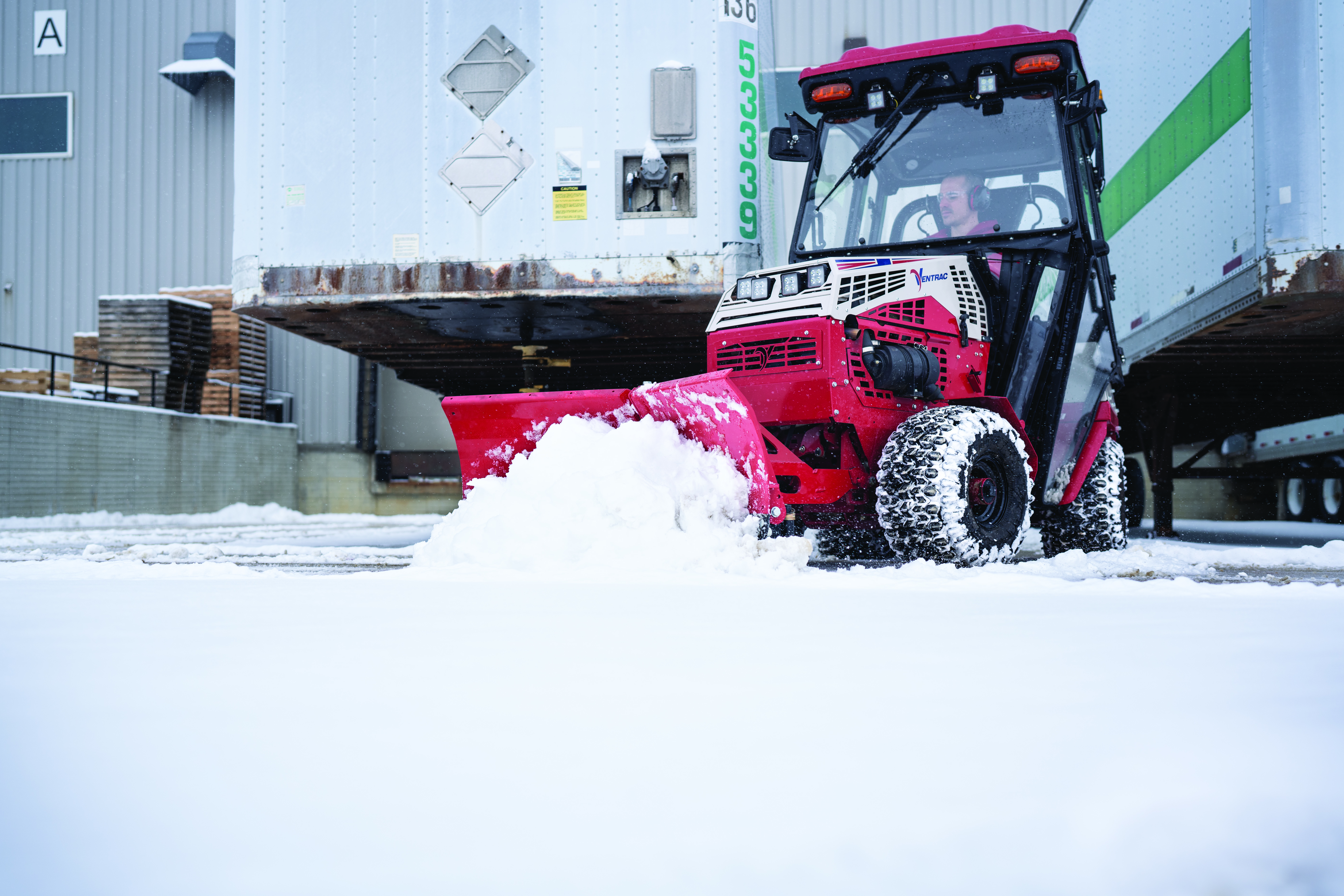 | Description | The Ventrac 4520 with a V-Blade clears snow from a loading dock, ensuring trucks can access the area without delay. Its compact size allows it to work close to docks and tight spaces, while the powerful blade efficiently moves snow aside. |