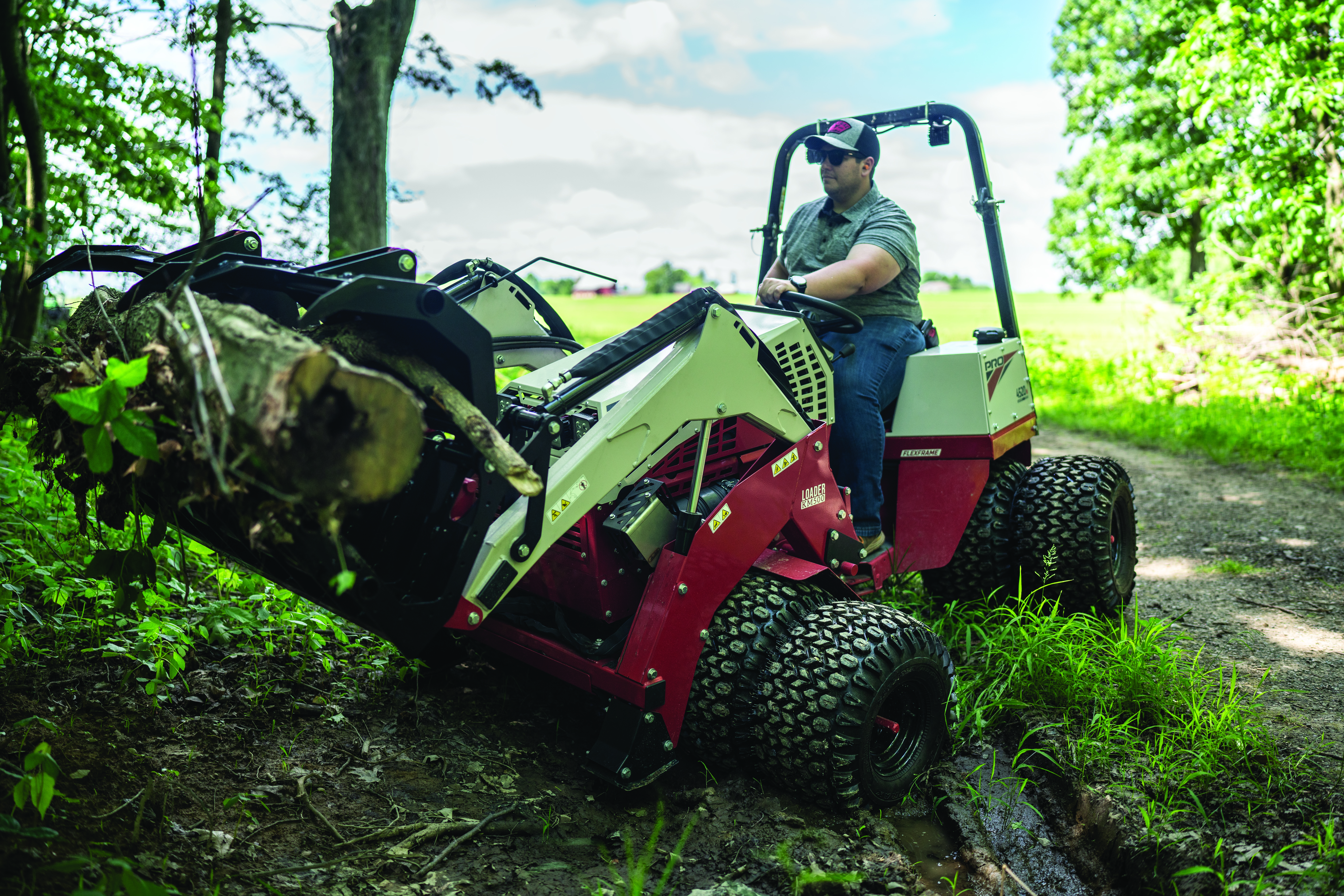 Ventrac Loader - Ventrac tractor with the KM500 Loader hauling brush from rugged, uneven trails. The FlexFrame design keeps the tractor stable and adaptable, making it easy to navigate tough terrain while handling heavy loads. Built for hard-to-reach jobs with unmatched versatility and performance.